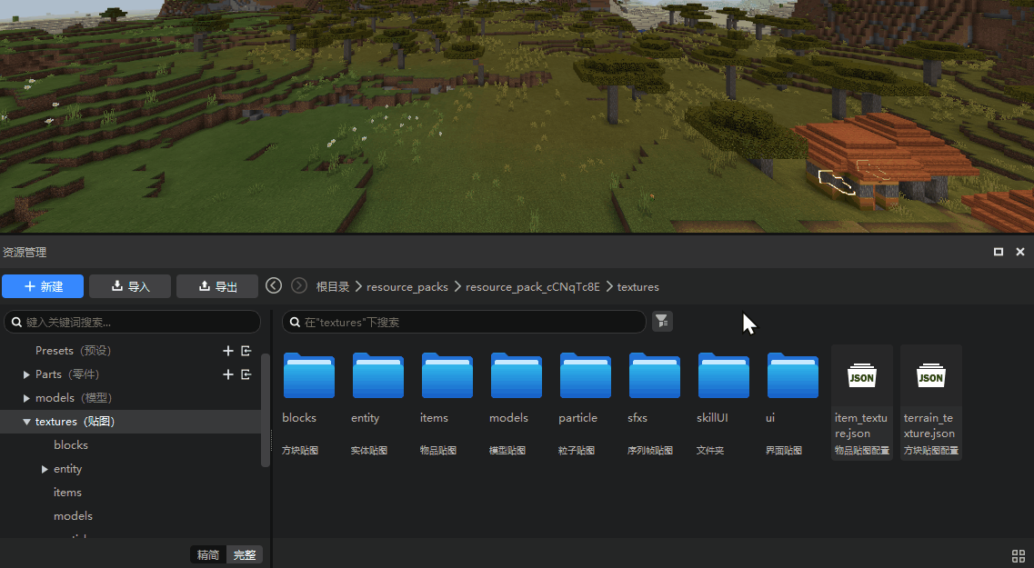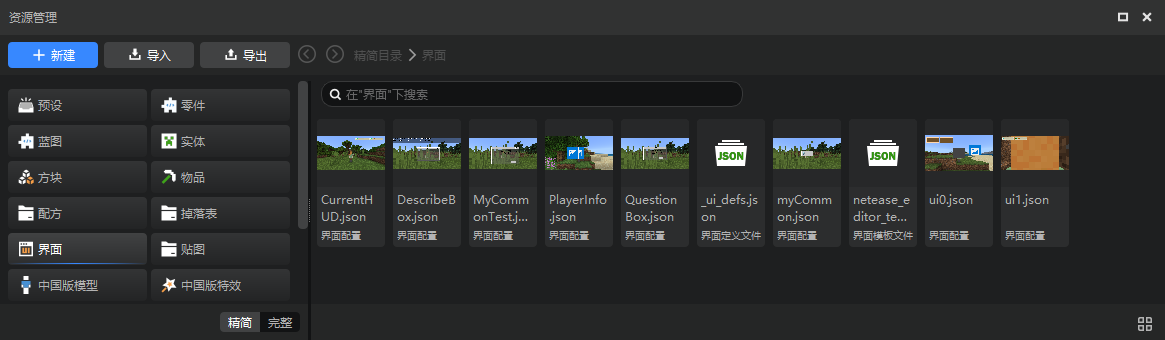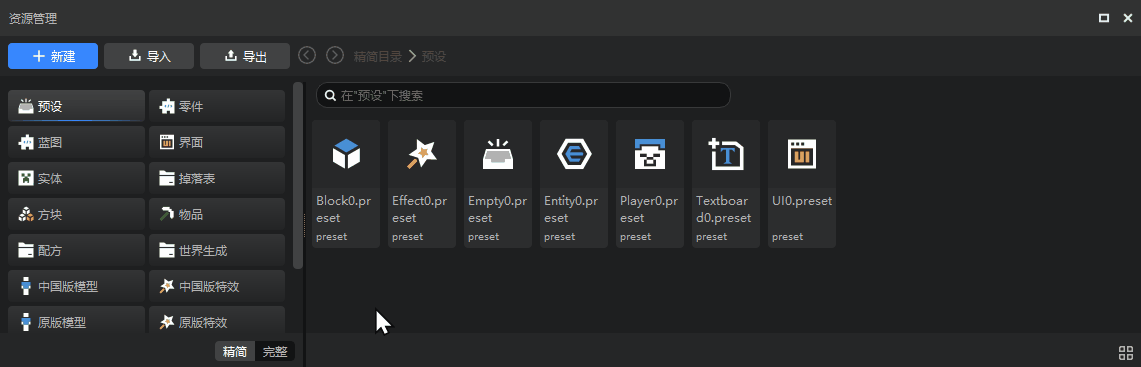 新版资源管理器新增【精简模式】,为不完全熟悉我的世界附加包文件结构的开发者提供一个比较简单明了的资源分类方式。在这个模式下,开发者定位自己需要的文件时,不再需要一层一层地展开完整的文件结构树,而是可以直接点击一个带图标的分类按钮,并直接在右侧找到该分类的所有文件。相比之前的完整模式,精简模式更适合日常的轻量级使用,以及新手开发者上手编辑器。