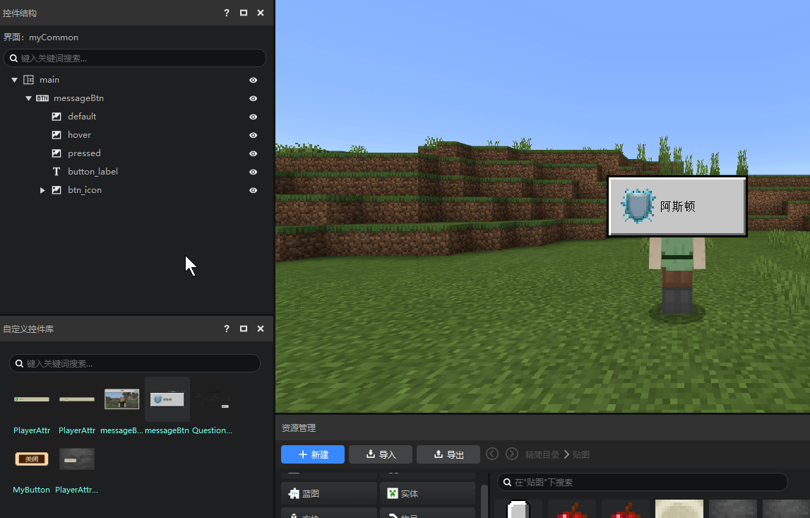 除去【自定义控件】,我们还更新了【变量】和【属性引用】功能。随着控件层级增加,自定义控件的数量增加,界面会变得越来越复杂,并且自定义控件(继承的控件)在使用时不能修改子控件的属性。我的世界有一种属性引用的特殊写法,可以在某个控件中修改其他控件的属性值,现在在编辑器中也支持了。例如下面这两个控件其实来源是同一个自定义控件,通过属性引用的方式修改成了不同的样子。