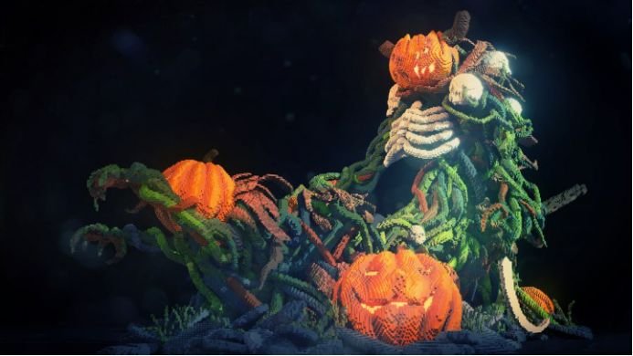 这个恐怖的南瓜人虽然没有什么大幅度的动作,但是靠着狰狞的表情和裸露的肋骨就非常吓人了。散落在周围的南瓜表情也比较丰富,不知道是他的手下败将还是臣民。